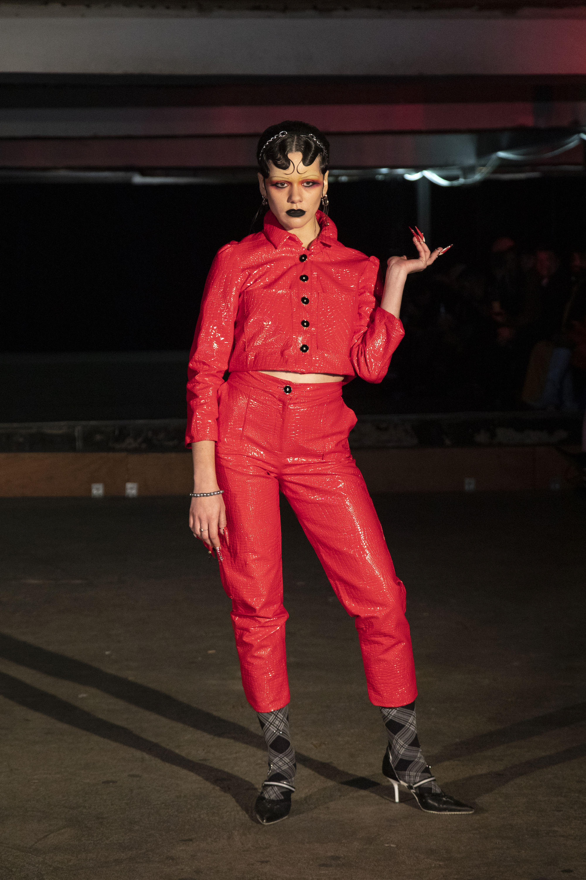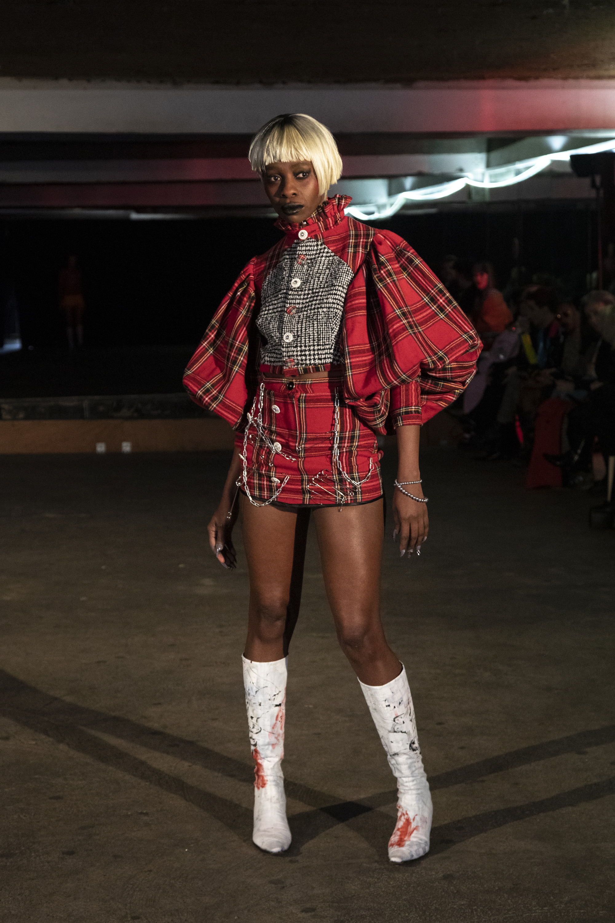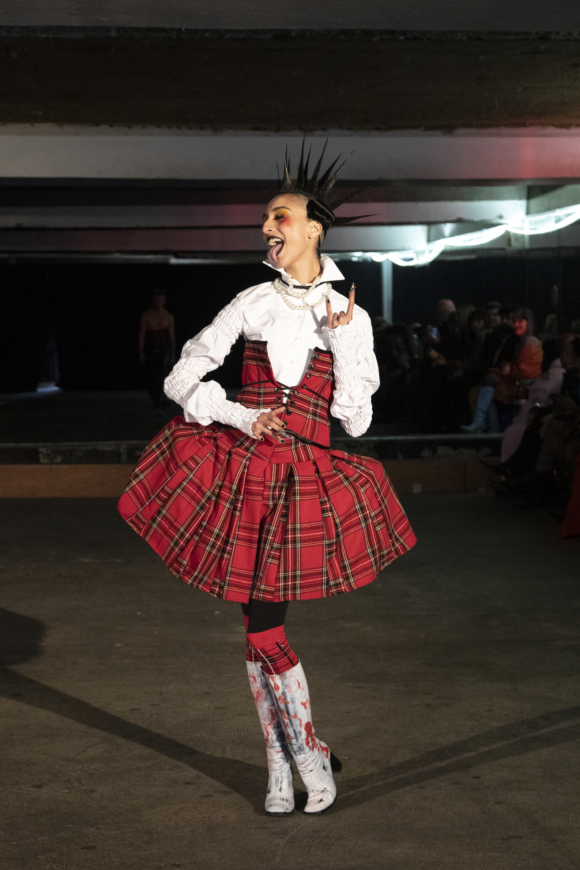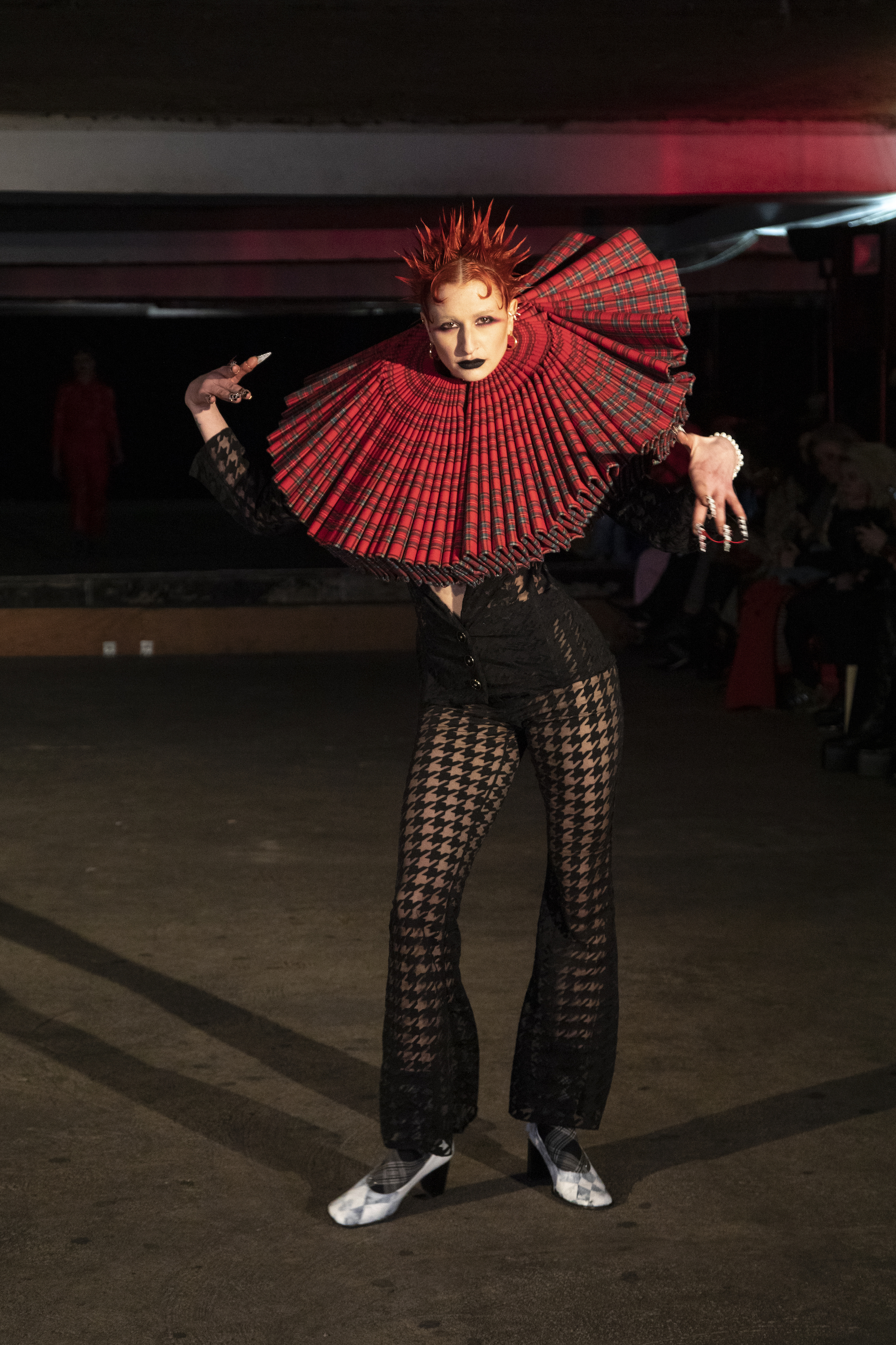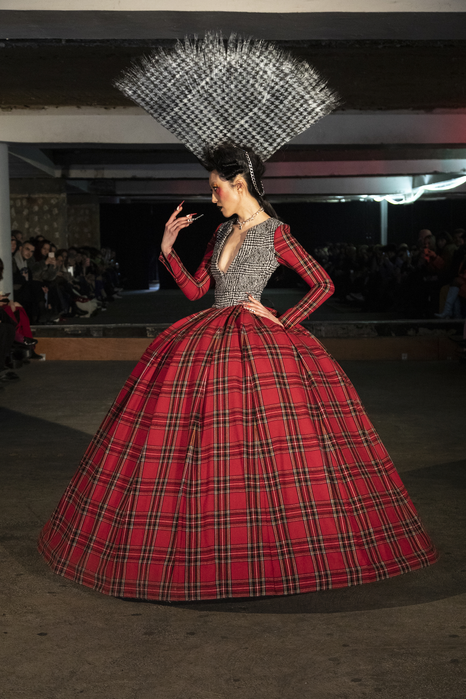 Solène Lescouët presented their new FW 22 collection entitled “Punkettes Attack” during the womens RTW Paris Fashion Week. The collection is a summary of the core values of the brand and the designer behind it who finds inspiration in Rock & Roll, Pop, Punk and the 70’s with a twist: the designer merged the style of the Punks from the 70’s with the Renaissance movement. The result is a collection that proves that those two worlds can be combined and underlines the designers desire for freedom and self-expression. The garments feature the emblematic tartan fabric, but also vegan leather-like vinyl, velvet and tulle. @solenelesouet@faxionpr